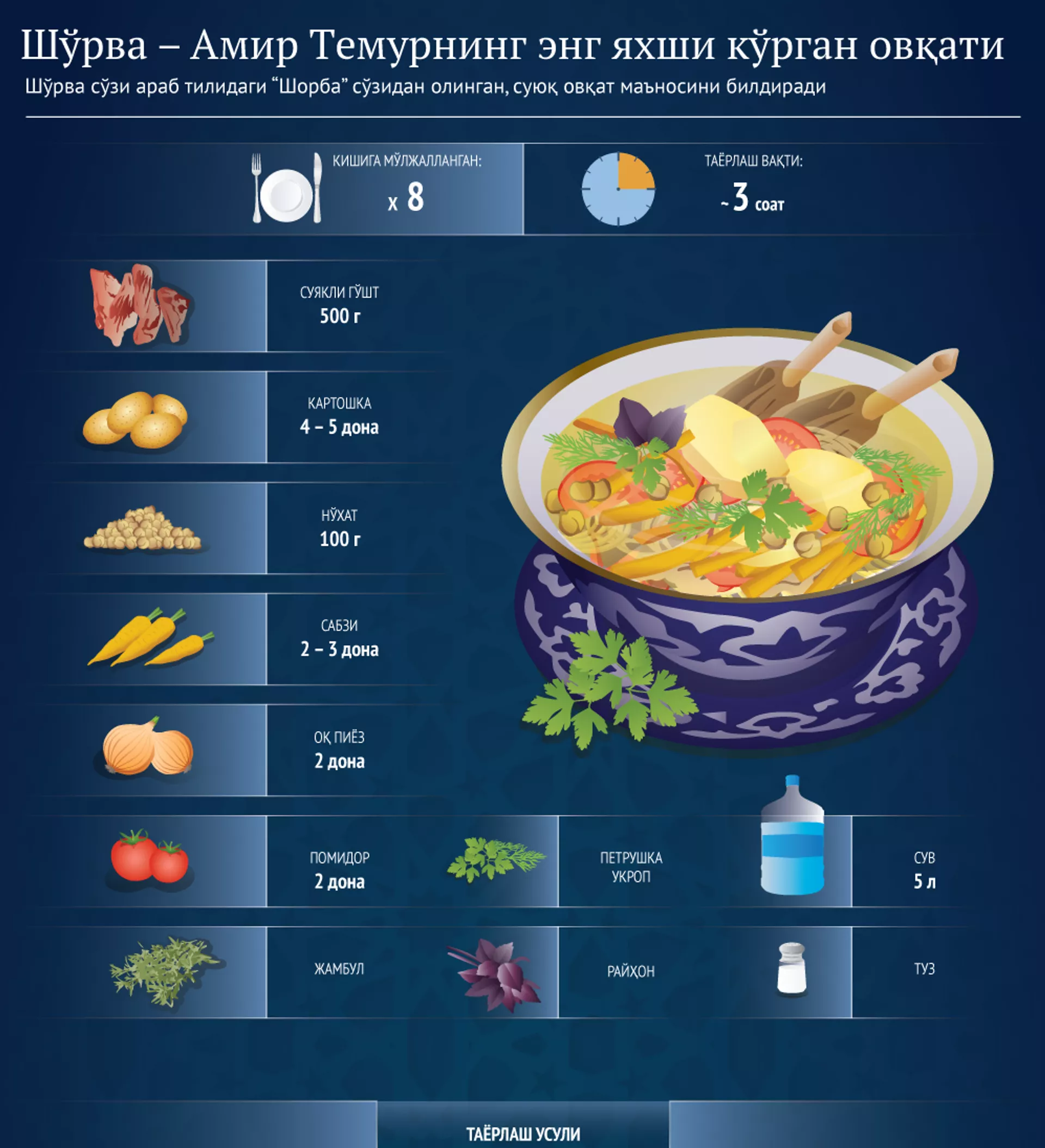 Yuqoridagi infografikamizda, Sputnik odatiga ko‘ra, sho‘rva pishirishning ko‘rgazmali retseptini keltiramiz. Siz hali sho‘rva pishirishni bilmasangiz, unga qarab osongina o‘rganib olishingiz mumkin.