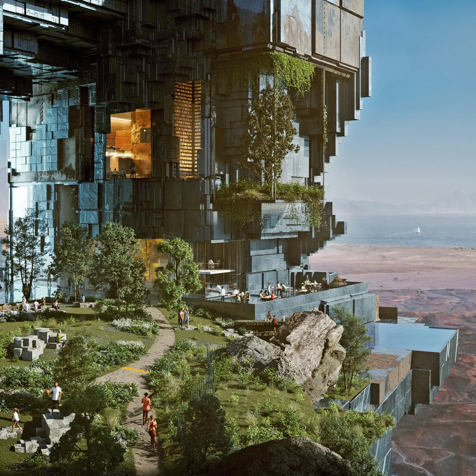© AFP 2023 / NEOM Ikki bino piyodalar o‘tish joylari orqali bog‘lanadi, ularning ostidan tezurar poyezd harakatlanadi.