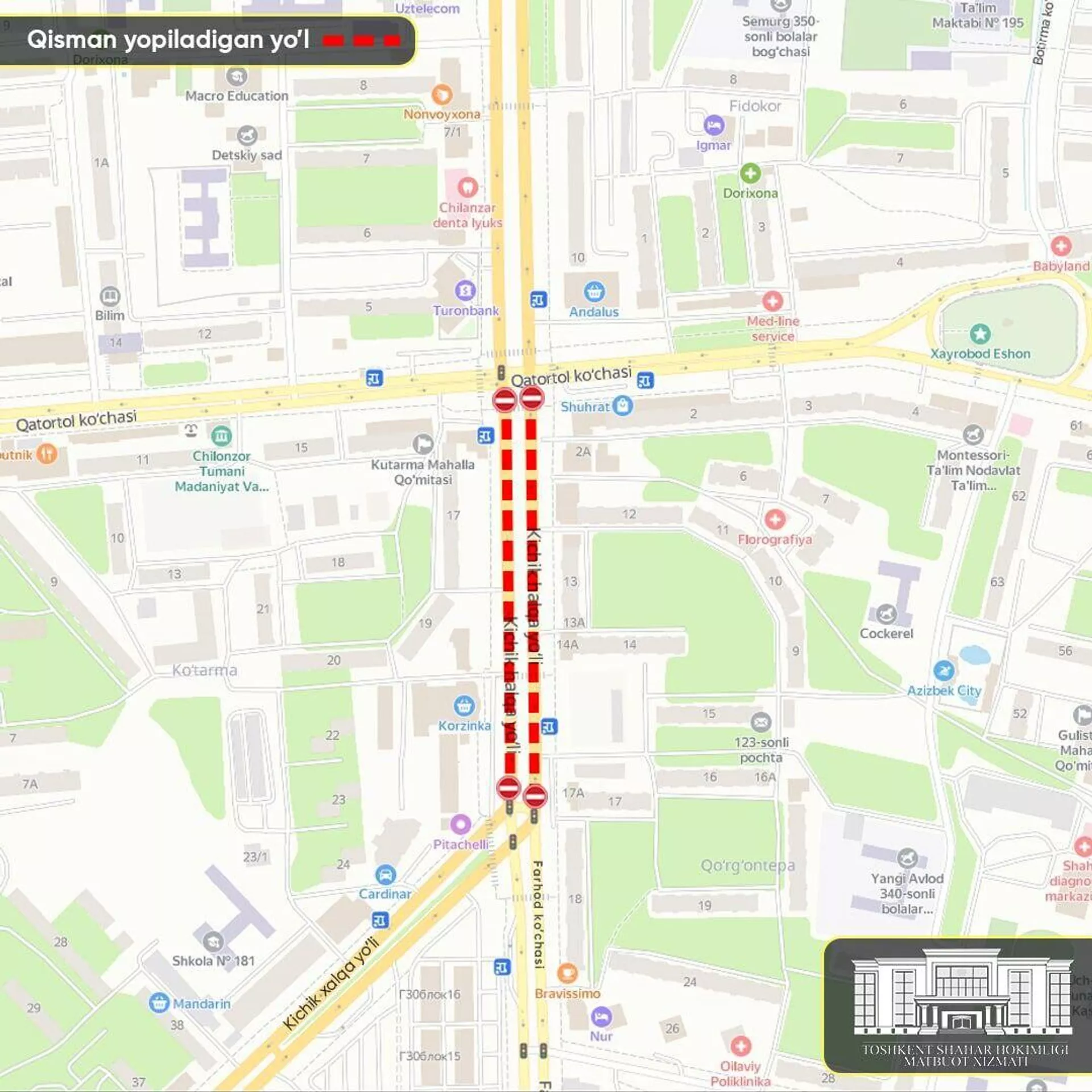 Ta’kidlanishicha, yo‘l ta’mirlash ishlari olib borilayotganligi sababli 20-noyabr kuni soat 9:00 dan 22-noyabr soat 22:00 ga qadar Kichik halqa yo‘li ko‘chasining Qatortol ko‘chasi bilan kesishmasidan Farhod ko‘chasi bilan kesishmasigacha bo‘lgan oralig‘i qisman yopildi.